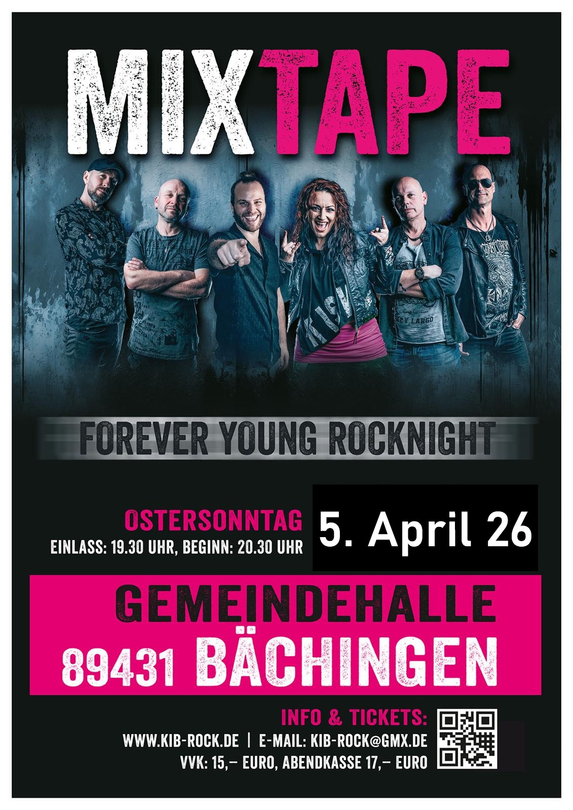 Mit unglaublicher Spielfreude, Energie und höchster Präzision huldigen die sechs Musiker von MIXTAPE dem Sound ihrer Jugend – einer wohl einzigartige Mischung der coolsten Rocksongs. Mit ihrer Leidenschaft für Rockmusik und einem beeindruckenden Repertoire an Rockklassikern gelingt es der Band die schweißtreibende Rocknacht-Atmosphäre vergangener Tage – wer erinnert sich nicht gerne an die legendären Osterrocknächte mit Härte 10 oder Big Trouble – zurück in die Halle nach Bächingen zu bringen.